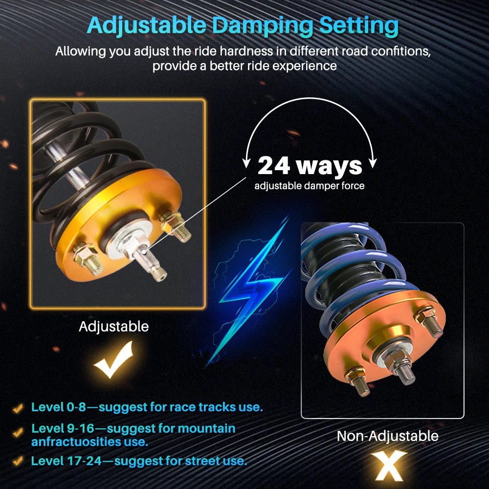 Take your suspension game to the next level with these 24-Way Adjustable Coilovers – engineered for performance and comfort!